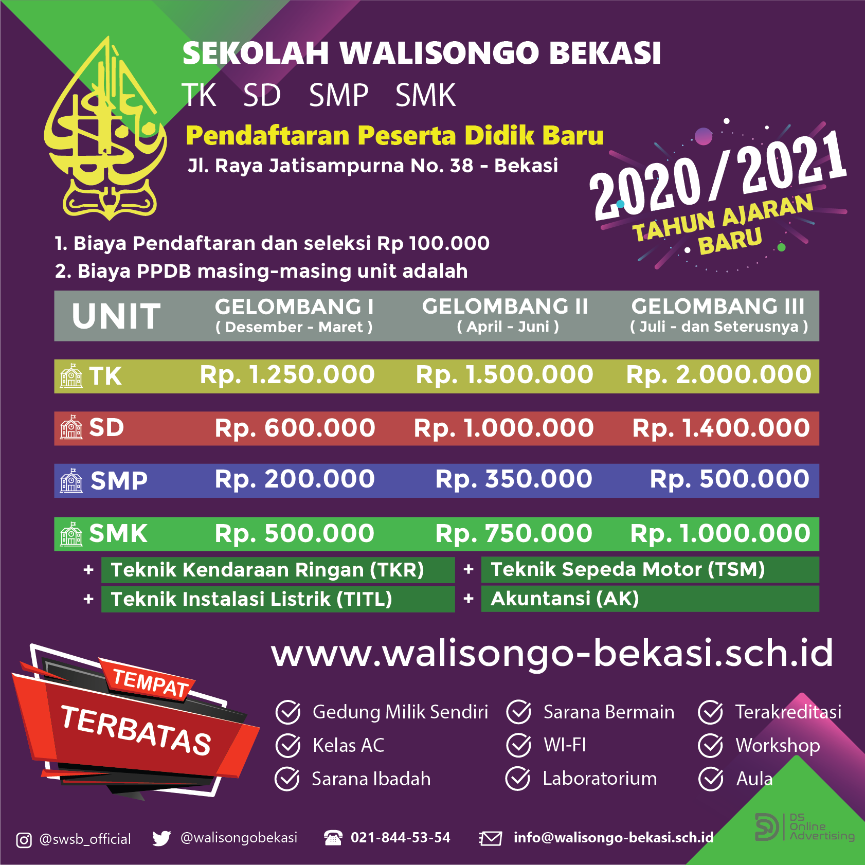 Biaya PSB dibagi menjadi 3 (tiga) gelombang pendaftaran adapun perinciannya, sebagai berikut :